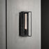 En væglampe lavet af et mat sort metalbur og kommer med et poleret sort marmor bagpanel.